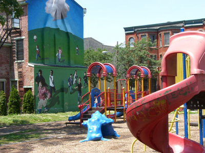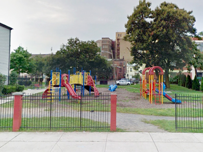 A neighborhood park provided with a small playground, tricycle track and a shaded picnic area and fitted out with a brick pier ornamental fence, seating and lights.