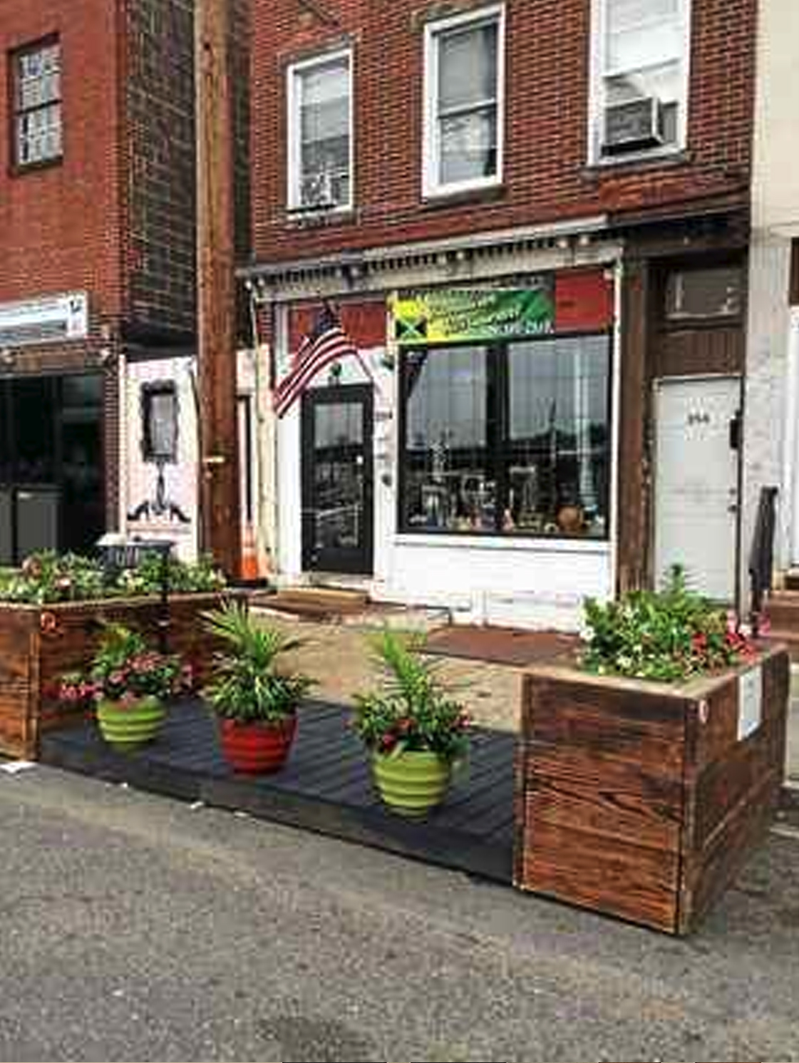 Full ArticleOutdoor dining has again gained interest on Trenton streets as Isles,Inc. reintroduced parklets. A parklet is a sidewalk extension that provides more space and opportunities for people using the street. Parklets may use several parking spaces as is the case at 128 West State Street Café and at Dapper’s Jamaican Restaurant at 254 North Clinton Ave.
